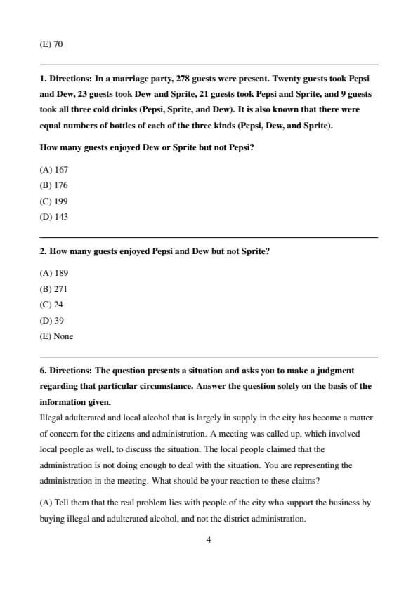 Thus, 11 guests enjoyed both Pepsi and Dew but not Sprite. However, this isn't an option. The correct answer is None of the above. Quick Tip: When working with set theory problems, be careful with the "not" condition. Subtract the guests who took all three drinks from those who took the two drinks you're interested in.