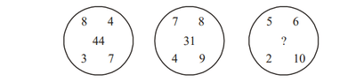 The logic for the number in the center of each circle is: \[ (Top-Left \times Bottom-Right) - (Top-Right \times Bottom-Left) \]