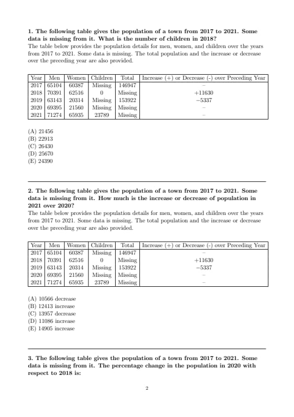 The following table gives the population of a town from 2017 to 2021. Some data is missing from it. How much is the increase or decrease of population in 2021 over 2020?