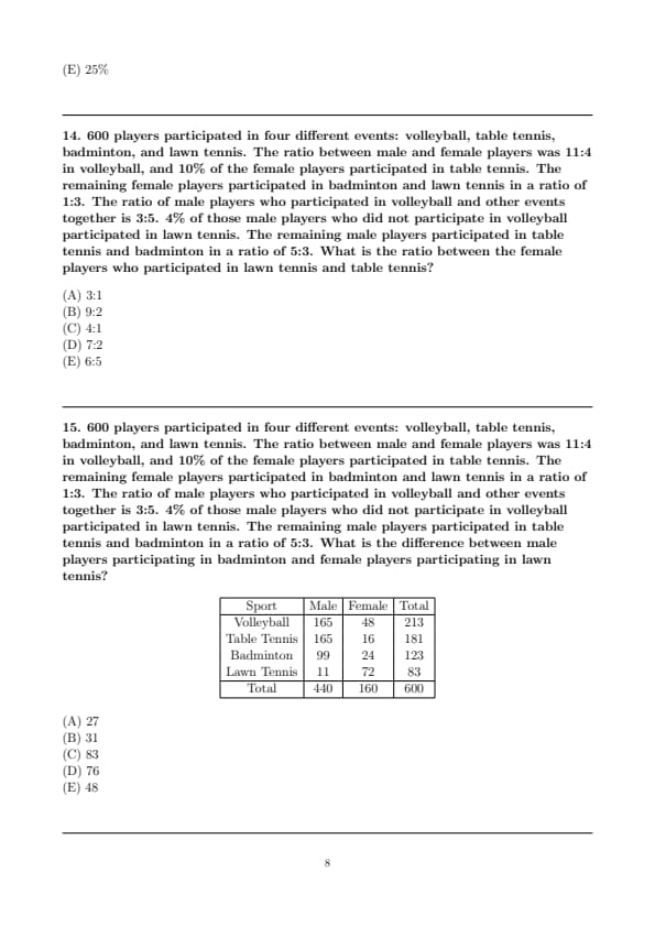 600 players participated in four different events: volleyball, table tennis, badminton, and lawn tennis. The ratio between male and female players was 11:4 in volleyball, and 10% of the female players participated in table tennis. The remaining female players participated in badminton and lawn tennis in a ratio of 1:3. The ratio of male players who participated in volleyball and other events together is 3:5. 4% of those male players who did not participate in volleyball participated in lawn tennis. The remaining male players participated in table tennis and badminton in a ratio of 5:3. What is the ratio between the female players who participated in lawn tennis and table tennis?