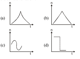 A sound source, emitting sound of constant frequency, moves with a constant speed and crosses a stationary observer. The frequency \(n\) of sound heard by the observer is plotted against time \(t\). Which of the following graphs represents the correct variation?