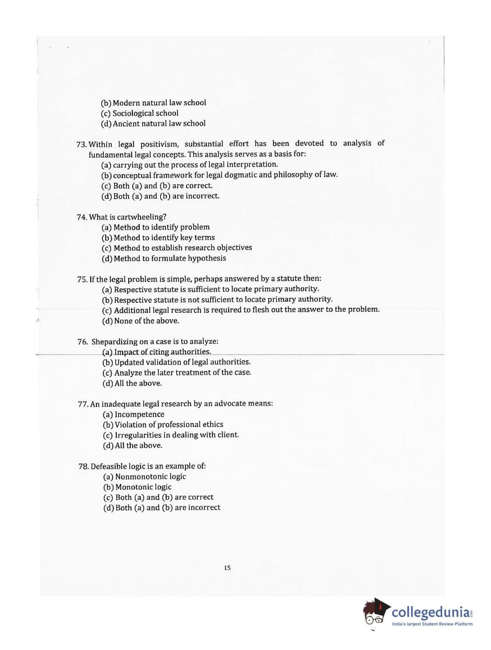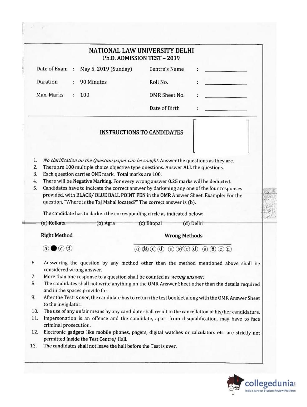 AILET 2019 PhD Question paper with answer key pdf conducted on May 5, 2019 in Afternoon Session (3 PM to 4:30 PM) is available for download. The exam was successfully organized by Delhi National Law University. The question paper comprised a total of 100 questions.