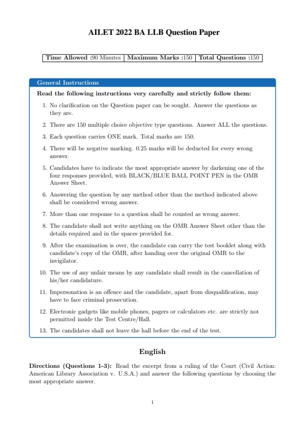 AILET 2022 BA LLB Question paper with answer key pdf conducted on June 26 is available for download. The exam was successfully organized by Delhi National Law University. The question paper comprised a total of 150 questions divided among three sections.
