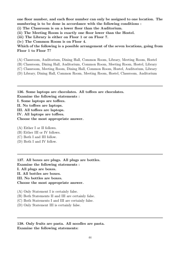 Seven locations (Classroom, Hostel, Library, Auditorium, Dining Hall, Meeting Room, and Common Room) within an unusual college campus are to be assigned floor numbers from 1 (lowest) to 7 (highest). Each location can only have one floor number, and each floor number can only be assigned to one location. The numbering is to be done in accordance with the following conditions :