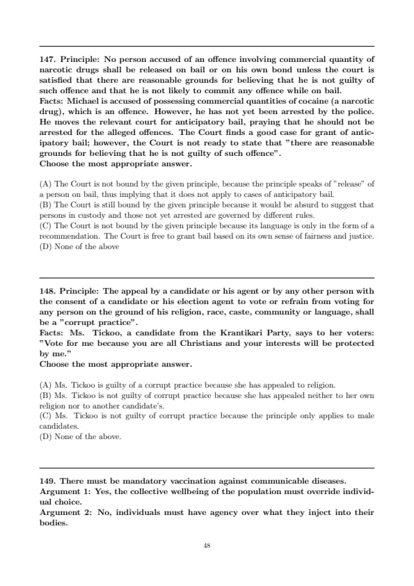 Facts: Michael is accused of possessing commercial quantities of cocaine (a narcotic drug), which is an offence. However, he has not yet been arrested by the police. He moves the relevant court for anticipatory bail, praying that he should not be arrested for the alleged offences. The Court finds a good case for grant of anticipatory bail; however, the Court is not ready to state that "there are reasonable grounds for believing that he is not guilty of such offence".