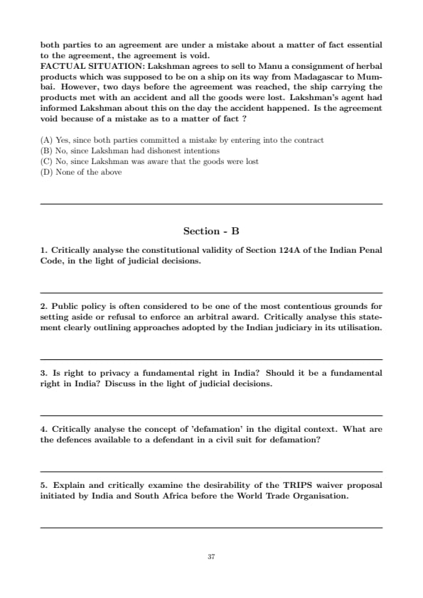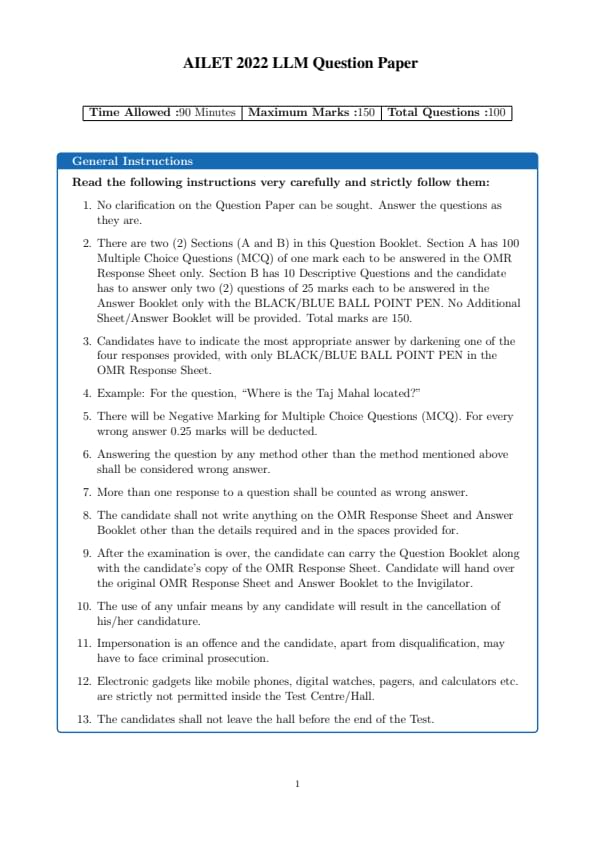 AILET 2022 LLM Question paper with answer key pdf conducted on June 26 is available for download. The exam was successfully organized by Delhi National Law University. The question paper comprised a total of 110 questions divided among two sections.
