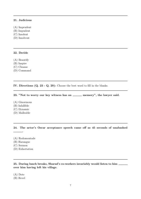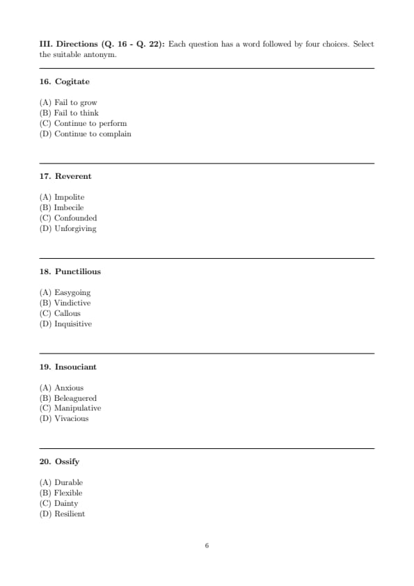 III. Directions (Q. 16 - Q. 22): Each question has a word followed by four choices. Select the suitable antonym.