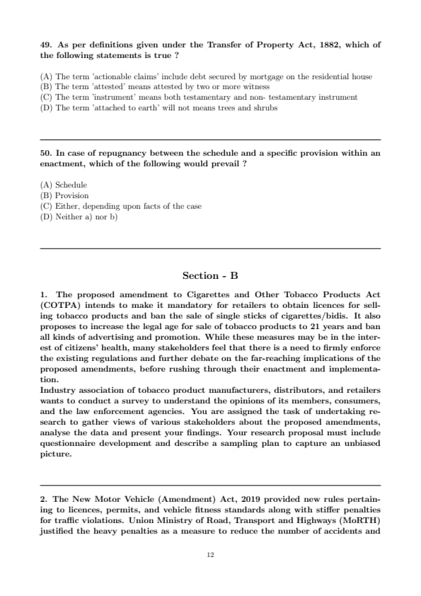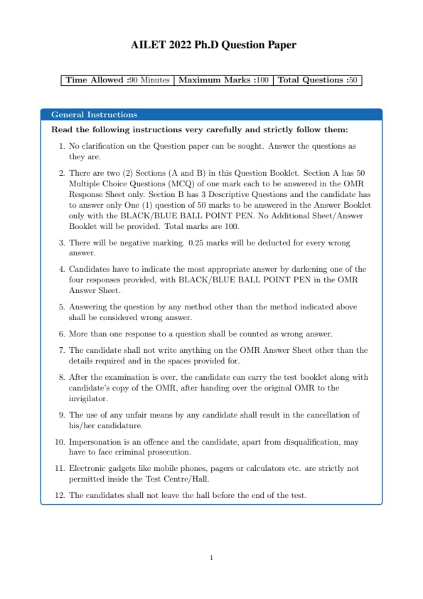 AILET 2022 PhD Question paper with answer key pdf conducted on June 26 is available for download. The exam was successfully organized by Delhi National Law University. The question paper comprised a total of 53 questions.