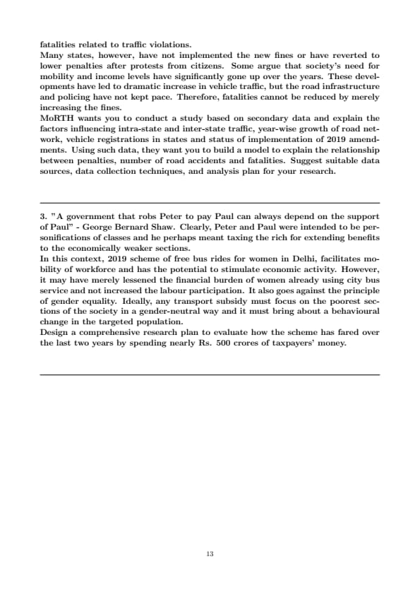 The primary hypothesis to be tested is whether the coefficient \( \beta_1 \) is negative and statistically significant. A significant negative \( \beta_1 \) would suggest that, after controlling for other factors like vehicle density and economic growth, the implementation of higher penalties is associated with a reduction in road fatalities. The model will also quantify the impact of other factors, helping to understand the relative importance of enforcement vs. infrastructure and traffic growth. Quick Tip: For research based on secondary data, the key is to clearly identify credible sources and define your variables precisely. When building a model, always consider potential confounding variables (like economic growth, road infrastructure) to avoid spurious correlations and ensure your conclusions are robust.