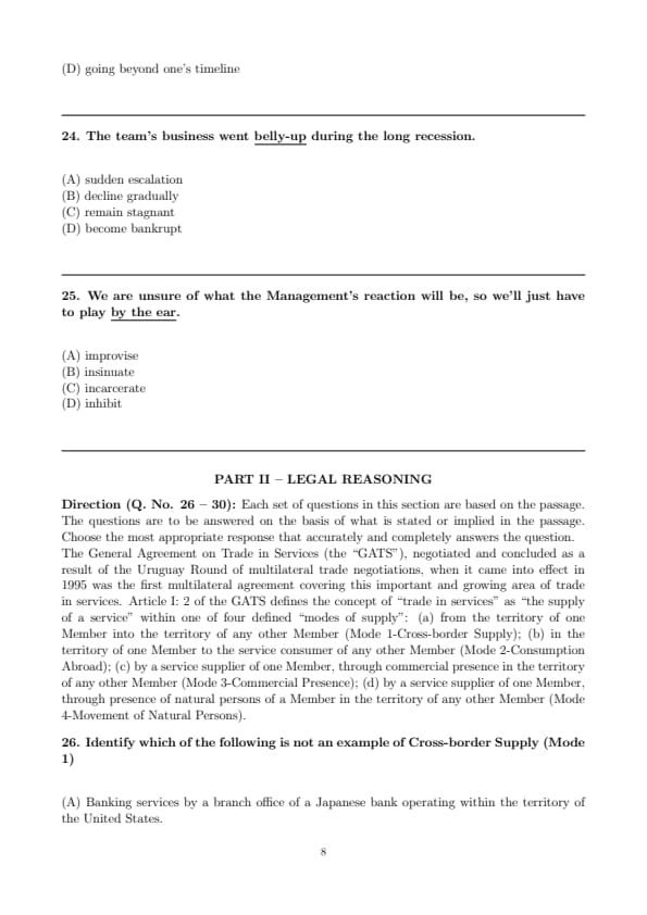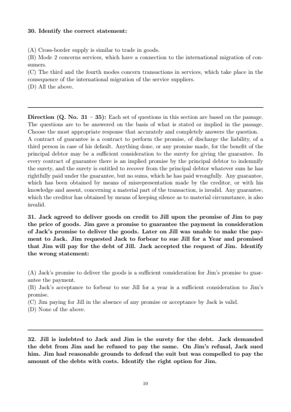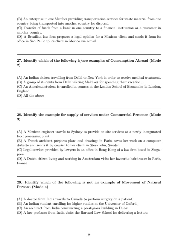 - (D) A Brazilian law firm prepares a legal opinion for a Mexican client and sends it from its office in Sao Paulo to its client in Mexico via e-mail: This is an example of Cross-border Supply (Mode 1), as the legal services are provided remotely across borders.
