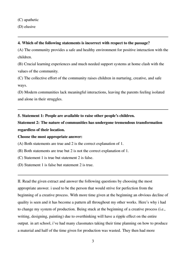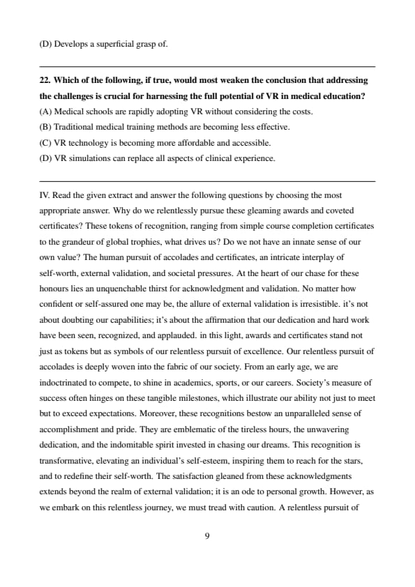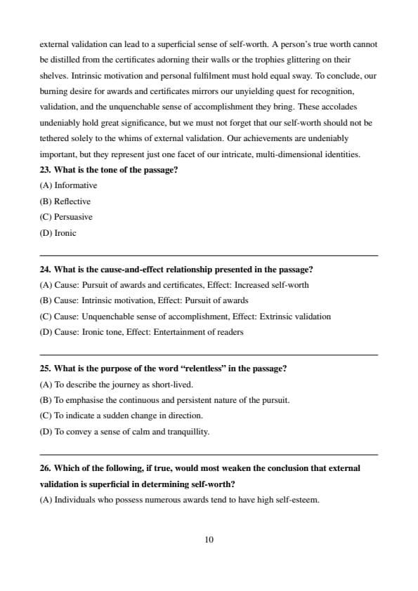 The correct answer is (B) because, based on the author’s views on awards and certificates, the author is likely to advocate for a reduced emphasis on external recognition. The author seems to suggest that personal growth and intrinsic motivation should take precedence over societal pressures and external validation. Quick Tip: When analyzing the author’s views, focus on the emphasis placed on intrinsic motivation and the critique of excessive reliance on external validation, such as awards and certificates.