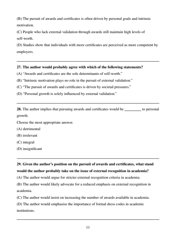 The correct answer is (C) because the author suggests that societal pressures play a significant role in motivating individuals to pursue awards and certificates. While external validation is a factor, the author is likely to agree that societal expectations contribute to this pursuit, influencing people's behavior and decisions. Quick Tip: When analyzing an author’s perspective, consider their emphasis on external factors like societal pressures, which often shape decisions and behaviors. Look for statements that reflect broader influences, not just individual motivations.