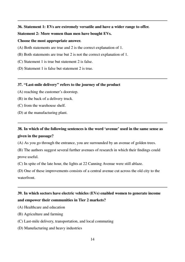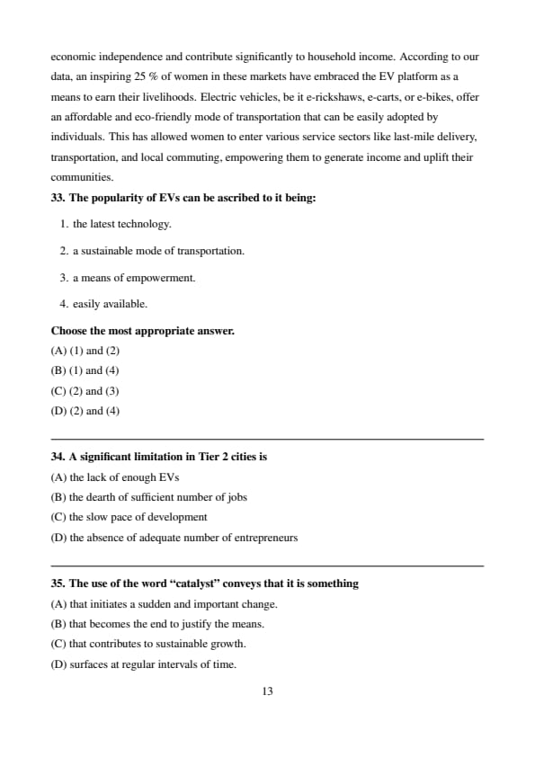 The correct answer is (C) because electric vehicles (EVs) have opened up opportunities for women in Tier 2 markets by enabling them to participate in sectors like last-mile delivery, transportation, and local commuting. These sectors offer flexible income-generating opportunities, empowering women to contribute economically and support their communities. Quick Tip: In analyzing the impact of new technologies like EVs, think about how they create opportunities for individuals in areas with limited access to traditional infrastructure. The flexibility of last-mile delivery and local transportation is a key enabler.