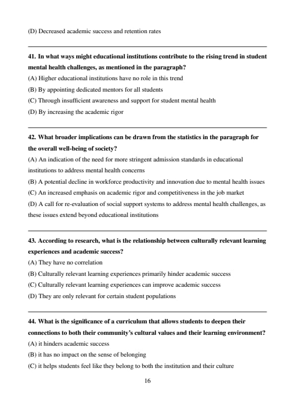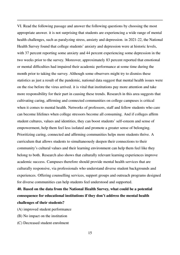 The correct answer is (D) because the broader implication suggested by the statistics is a need for society to re-evaluate and strengthen social support systems to address mental health challenges, which affect not only students but also the wider population. These issues extend beyond educational institutions and can influence various aspects of life, including employment and social interactions. Quick Tip: Mental health challenges are not isolated to any one group; they have far-reaching effects. Addressing mental health requires a holistic approach, including changes to social support systems, workplace policies, and educational practices.