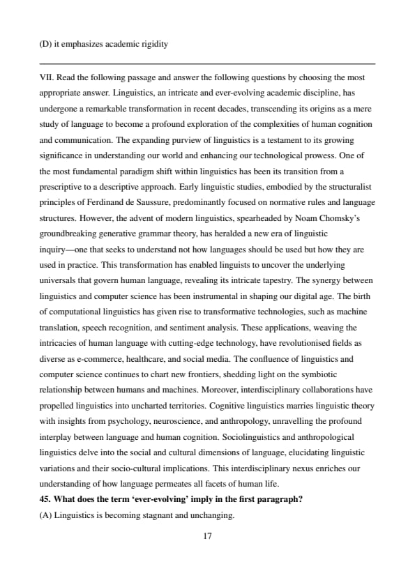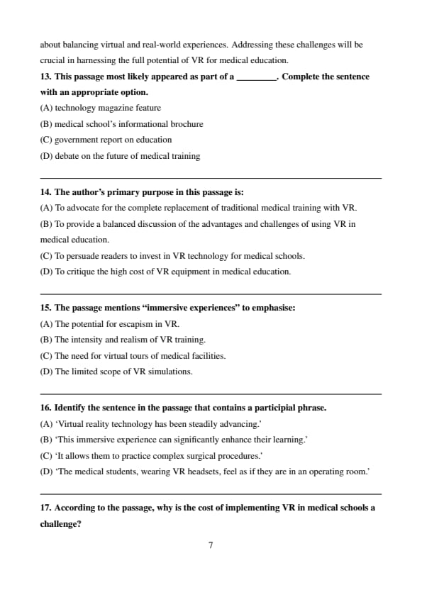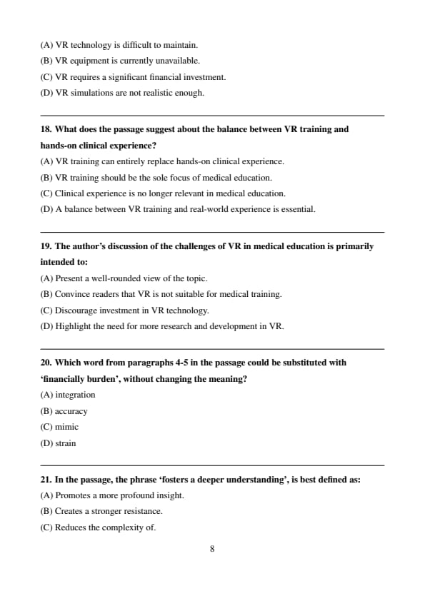The correct answer is (A) because the author discusses both the advantages and challenges of using VR in medical education, offering a balanced perspective on the topic. By presenting the challenges, the author provides a more comprehensive view of VR’s role in medical training, rather than focusing solely on its shortcomings or advocating for its complete adoption. Quick Tip: When an author addresses both pros and cons, the intention is often to present a well-rounded view, allowing the reader to form a more informed opinion on the topic.
