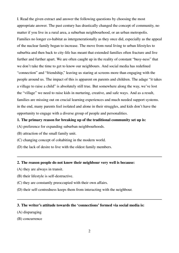The breaking up of traditional community setups can primarily be attributed to the growing preference for the small family unit. In modern society, people are increasingly seeking privacy and independence, which makes the concept of a small nuclear family more attractive. This shift has led to the fragmentation of extended families and traditional community structures that relied heavily on multi-generational cohabitation. Quick Tip: In modern social dynamics, family structure is constantly evolving, influenced by factors such as urbanization, lifestyle preferences, and changing societal values.