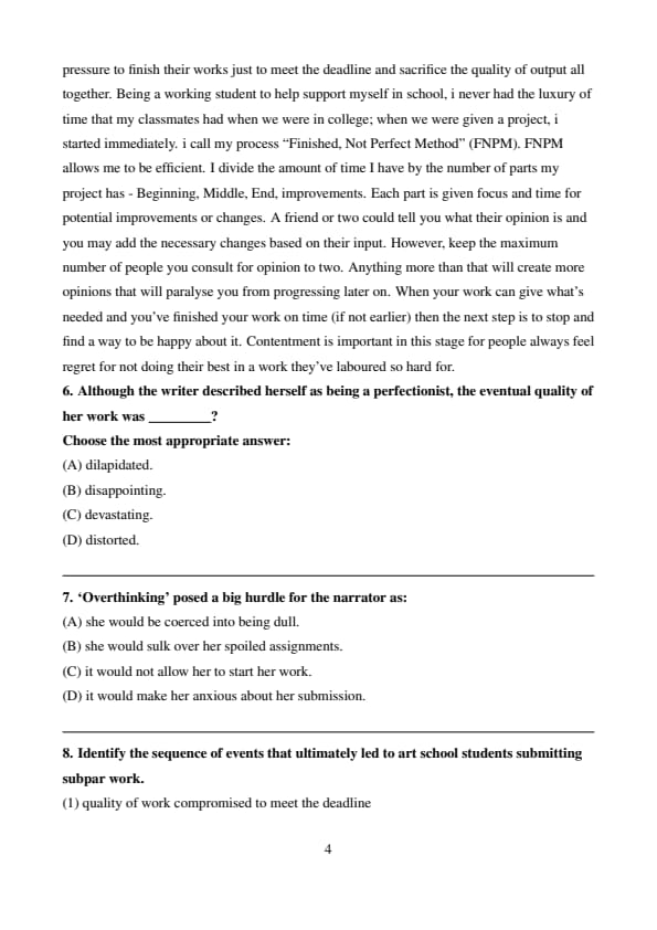 The most appropriate answer is "disappointing" because despite the writer's self-identification as a perfectionist, the quality of her work did not meet her high standards. This suggests that her work, though expected to be flawless, ended up being less than satisfactory or not as good as she hoped. Quick Tip: When interpreting descriptions of personal traits like perfectionism, consider how those traits might influence the outcome of the task at hand. Perfectionism can sometimes lead to unrealistic expectations, which may result in disappointment.