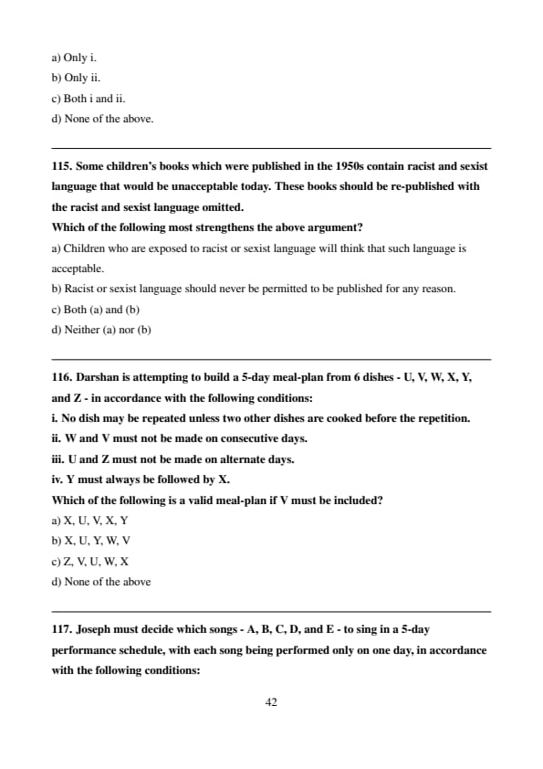 Darshan is attempting to build a 5-day meal-plan from 6 dishes - U, V, W, X, Y, and Z - in accordance with the following conditions: