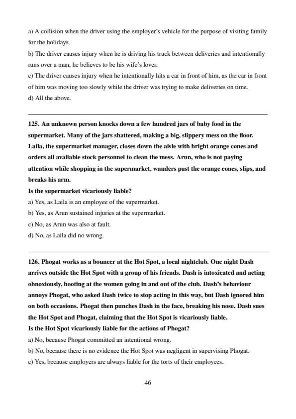 Step 4: Since Laila did no wrong and the supermarket took reasonable precautions, there is no basis for vicarious liability. Quick Tip: Vicarious liability requires employee wrongdoing. If the employee acted reasonably and the harm was due to the injured party’s own negligence, liability may not apply.