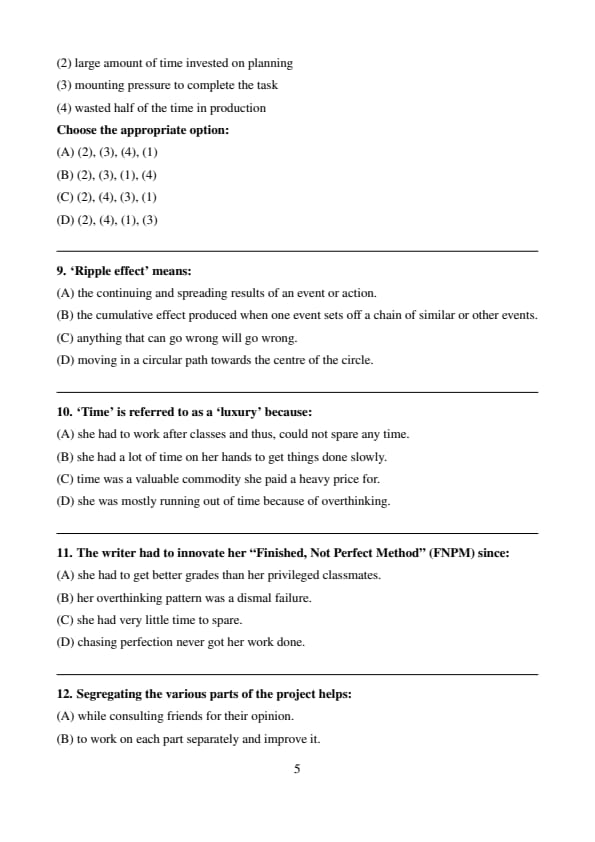 The correct sequence is (2), (4), (3), (1). The students first invested a large amount of time in planning (2), which caused them to waste half of their time in production (4). This led to mounting pressure to complete the task (3), and ultimately, the quality of their work was compromised to meet the deadline (1). Quick Tip: When analyzing a sequence of events, start by identifying the cause of the issue and trace it through to the final outcome, noting how each step leads to the next.
