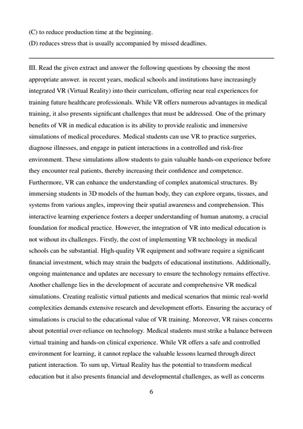 The correct answer is (D) because the passage suggests that while VR training is beneficial, it should be used in conjunction with hands-on clinical experience. Both are important for a well-rounded medical education, as VR provides simulations and practice, but real-world experience is necessary for developing practical skills and judgment. Quick Tip: In evaluating a balance between two methods or techniques, consider how each can complement the other. In education, blending innovative tools like VR with traditional methods often leads to the most effective learning outcomes.
