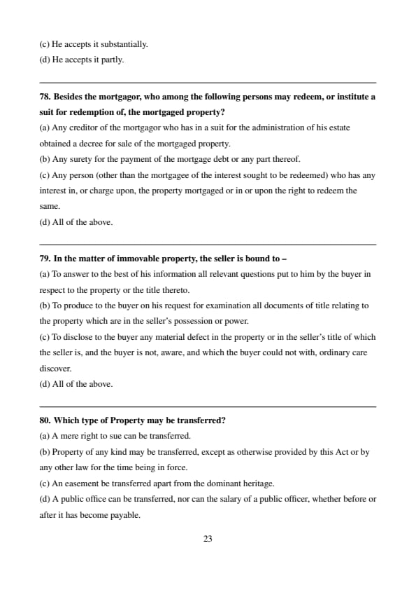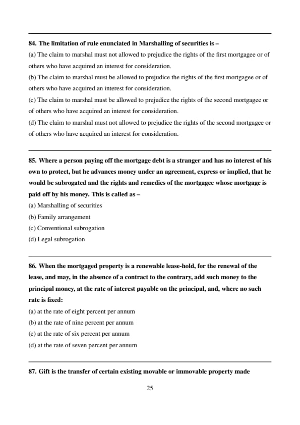 Conclusion: Option (a) is correct — marshalling must not prejudice the rights of the first mortgagee or others with consideration-based interests. Quick Tip: Marshalling protects subsequent mortgagees — but not at the cost of harming prior mortgagees or bona fide purchasers.