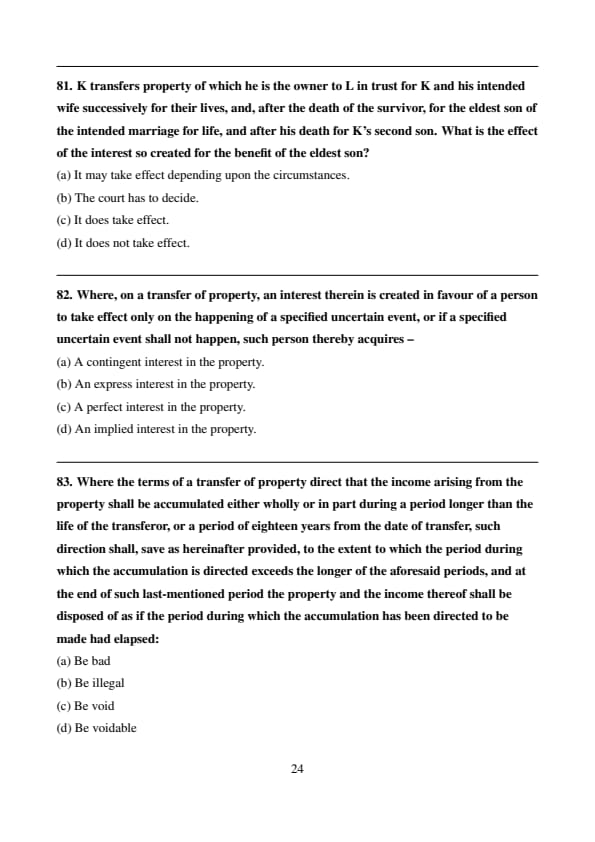 Conclusion: Option (c) is correct — the direction is void under Section 17 of the Transfer of Property Act. Quick Tip: The law limits accumulation of income to prevent indefinite withholding of property benefits — beyond 18 years or the transferor’s life, it’s void.
