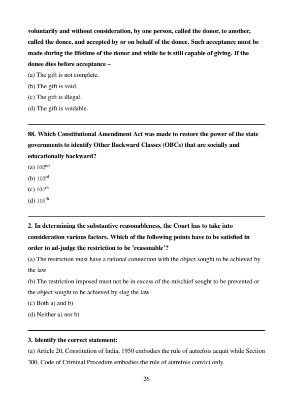 Conclusion: Option (b) is correct — the gift is void if the donee dies before acceptance. Quick Tip: No acceptance, no gift — under Section 122, acceptance during the donor’s lifetime is essential for validity.