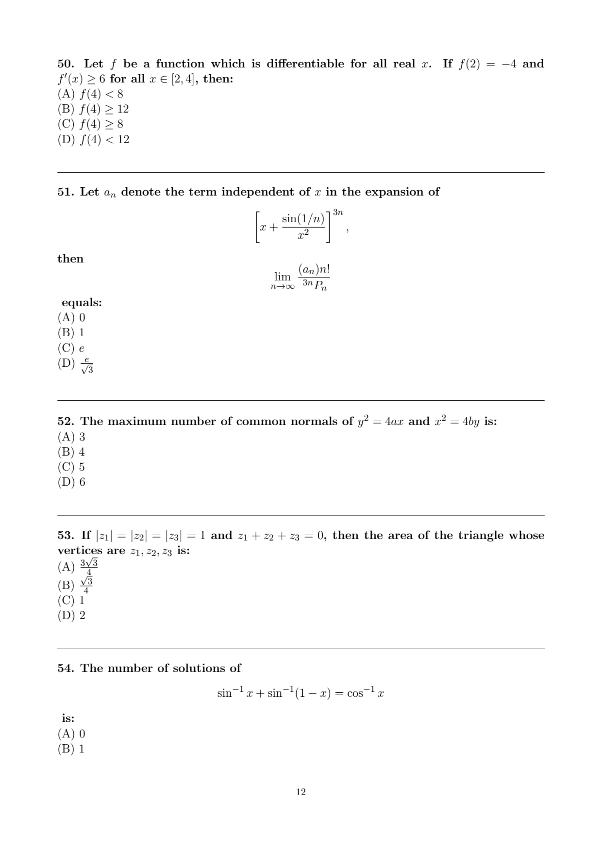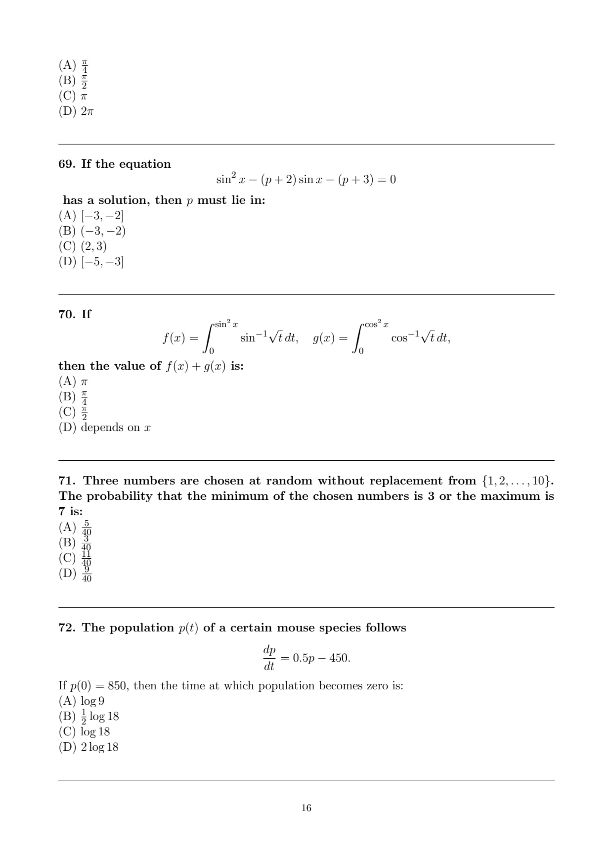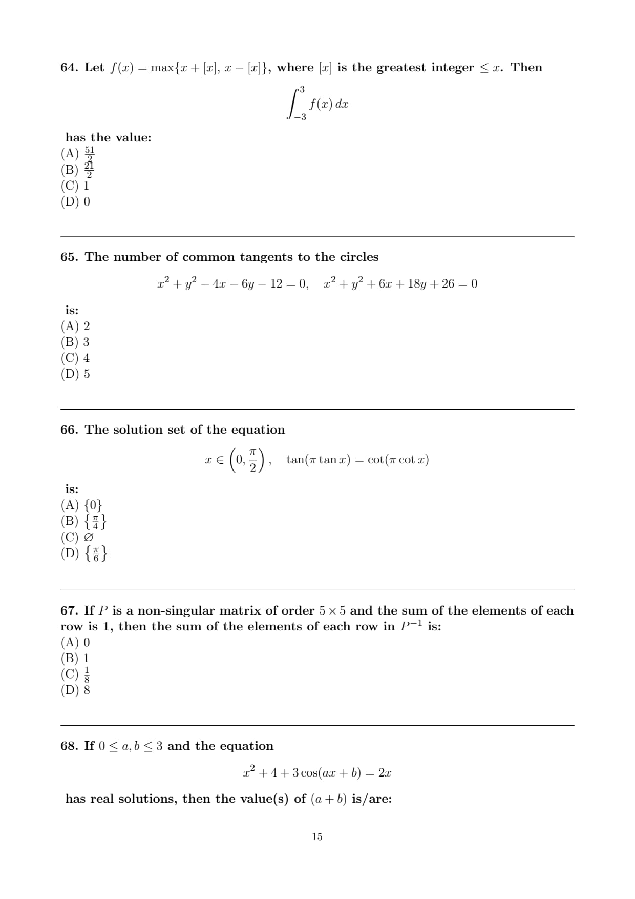 Combined integral reduces to: \[ \int_0^1 \frac{\pi}{2} \, dt = \frac{\pi}{2} \] Quick Tip: For paired inverse trig integrals: Use \( \sin^{-1}u + \cos^{-1}u = \frac{\pi}{2} \). Convert limits to match.