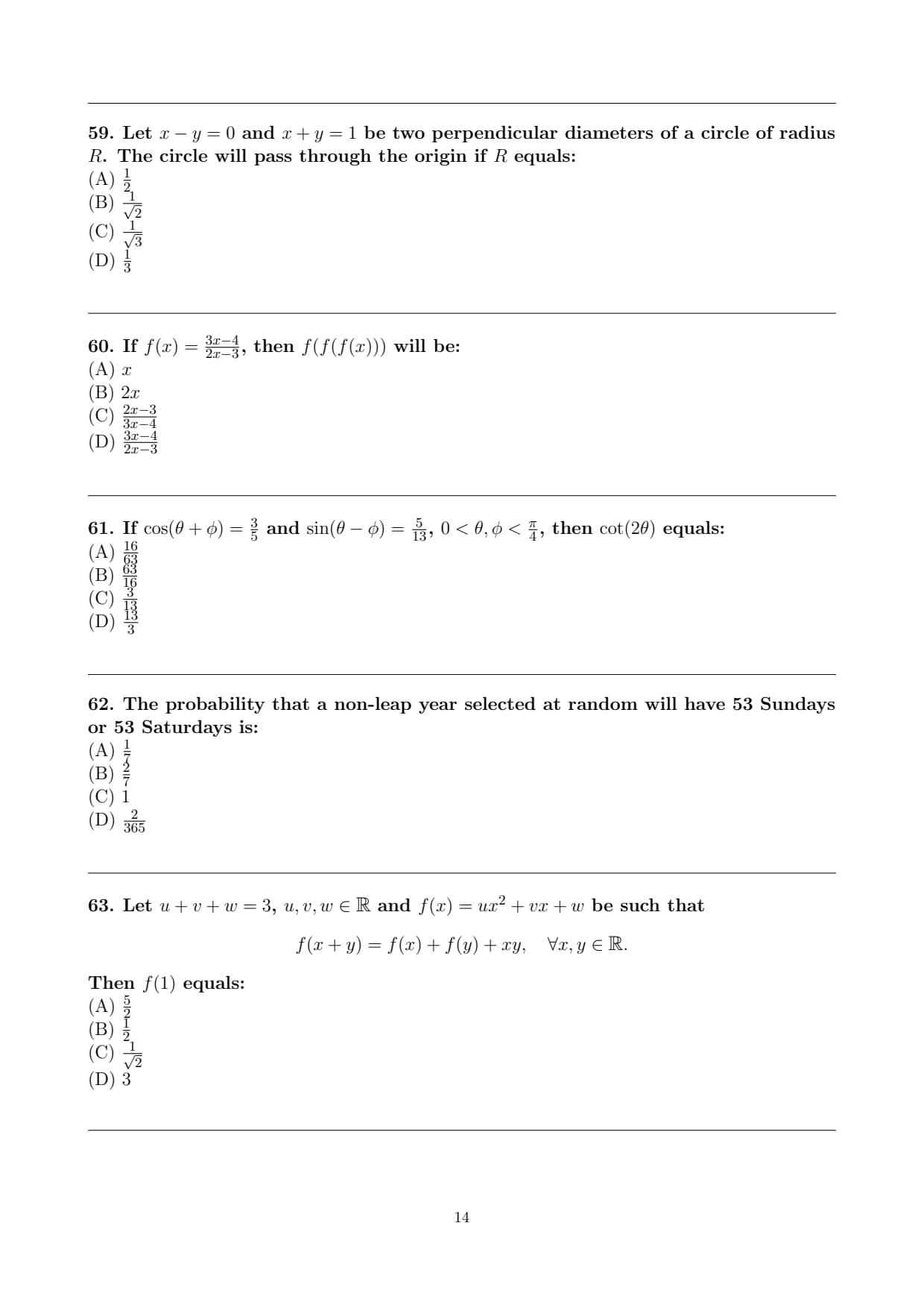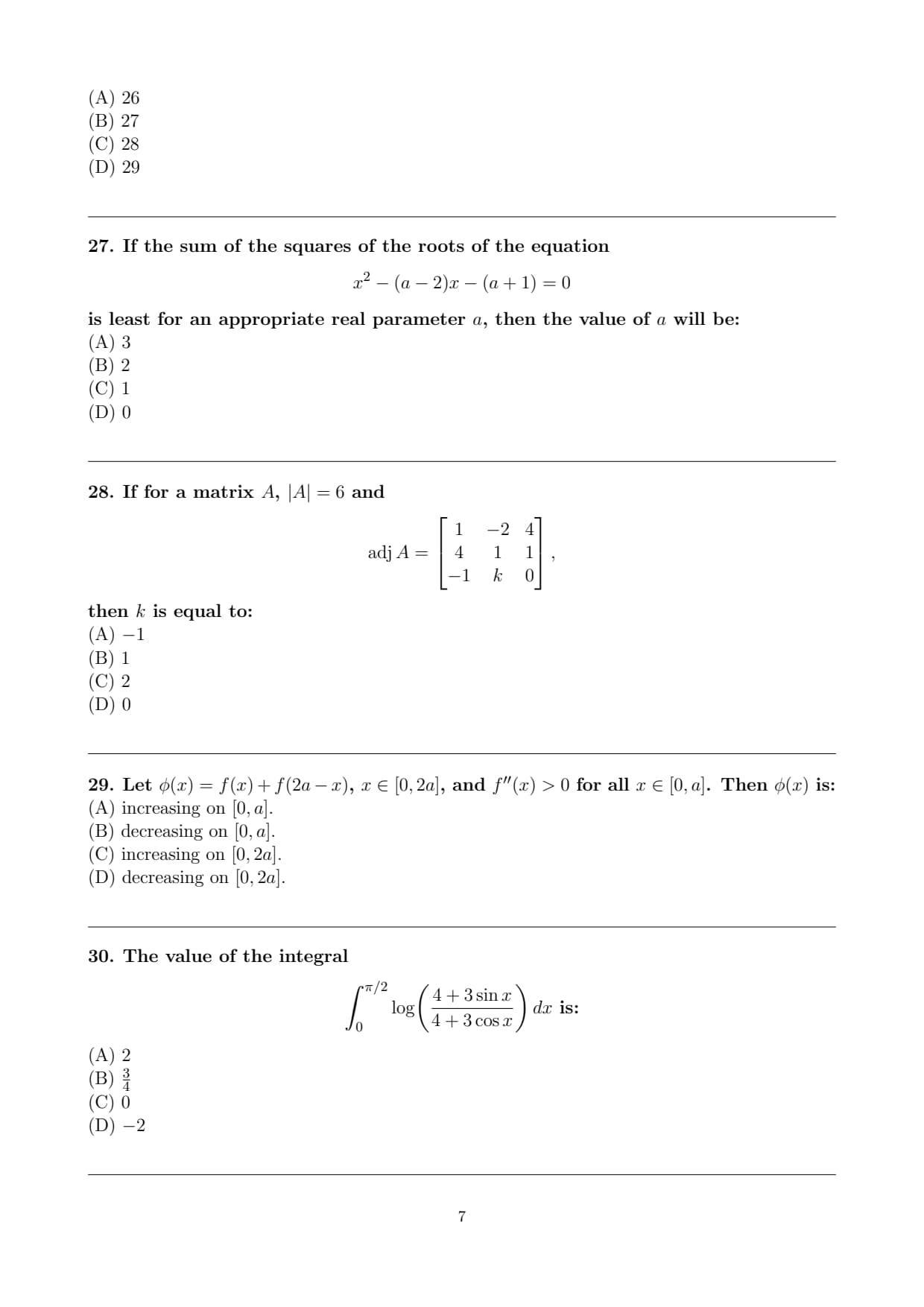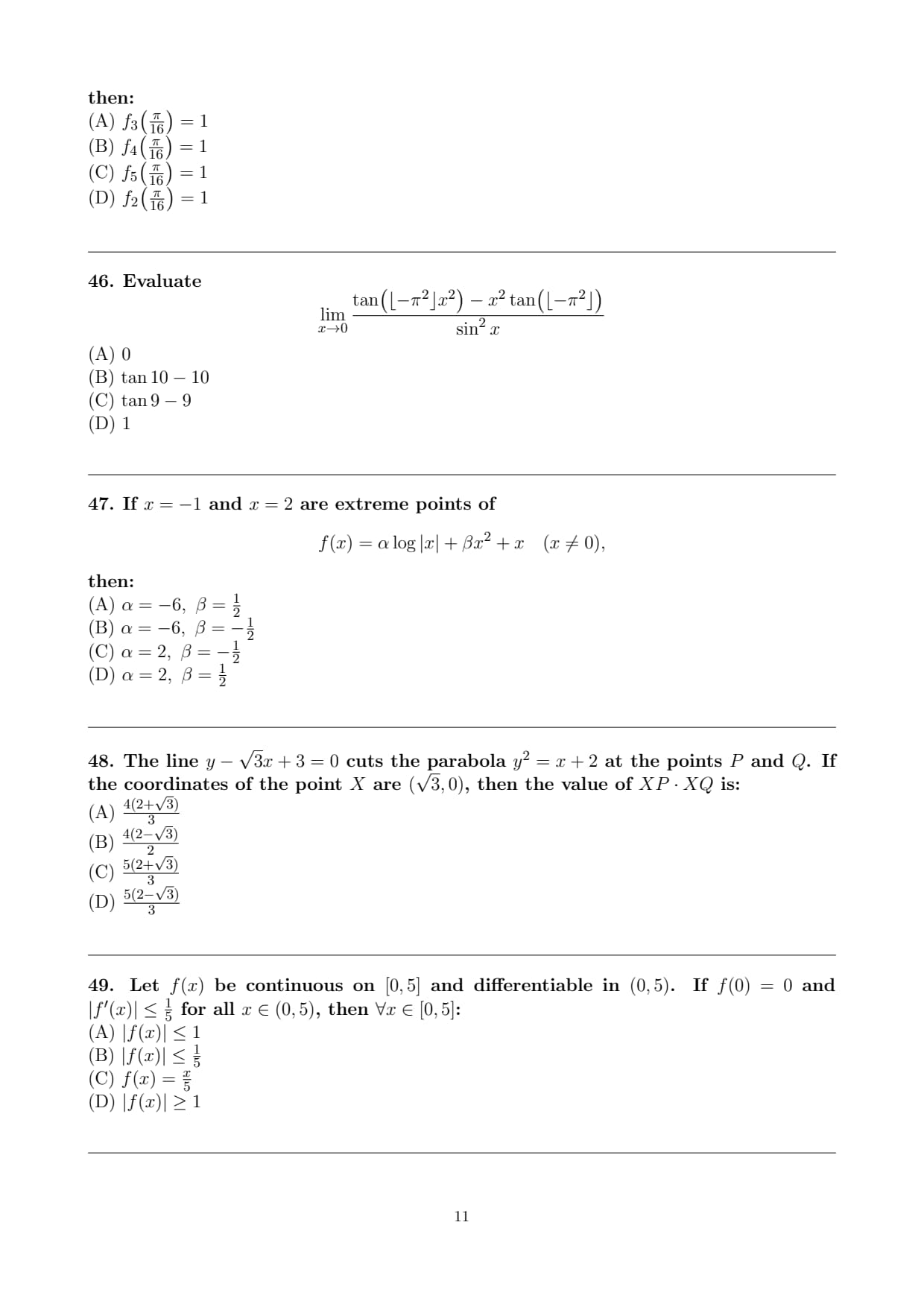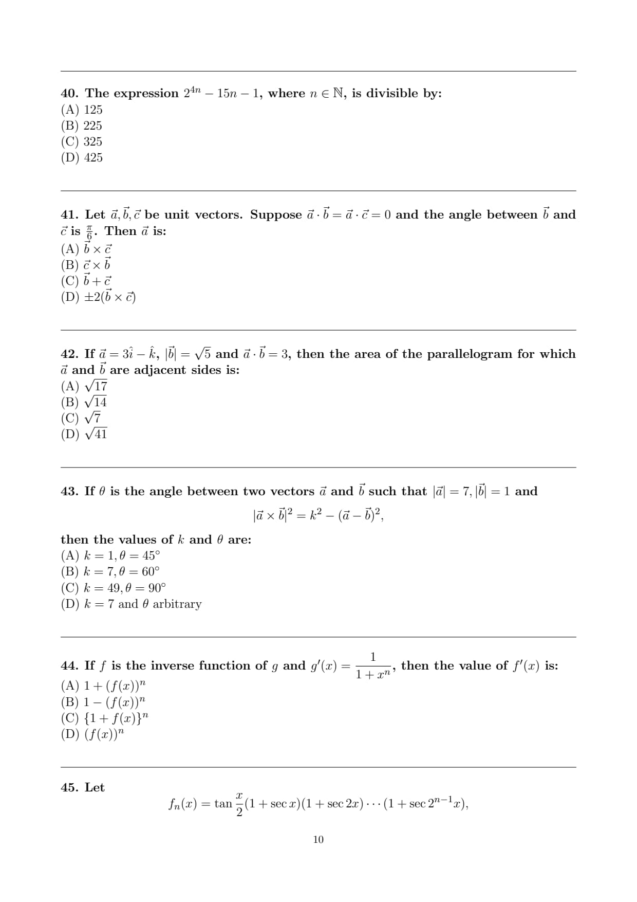 Combined integral reduces to: \[ \int_0^1 \frac{\pi}{2} \, dt = \frac{\pi}{2} \] Quick Tip: For paired inverse trig integrals: Use \( \sin^{-1}u + \cos^{-1}u = \frac{\pi}{2} \). Convert limits to match.