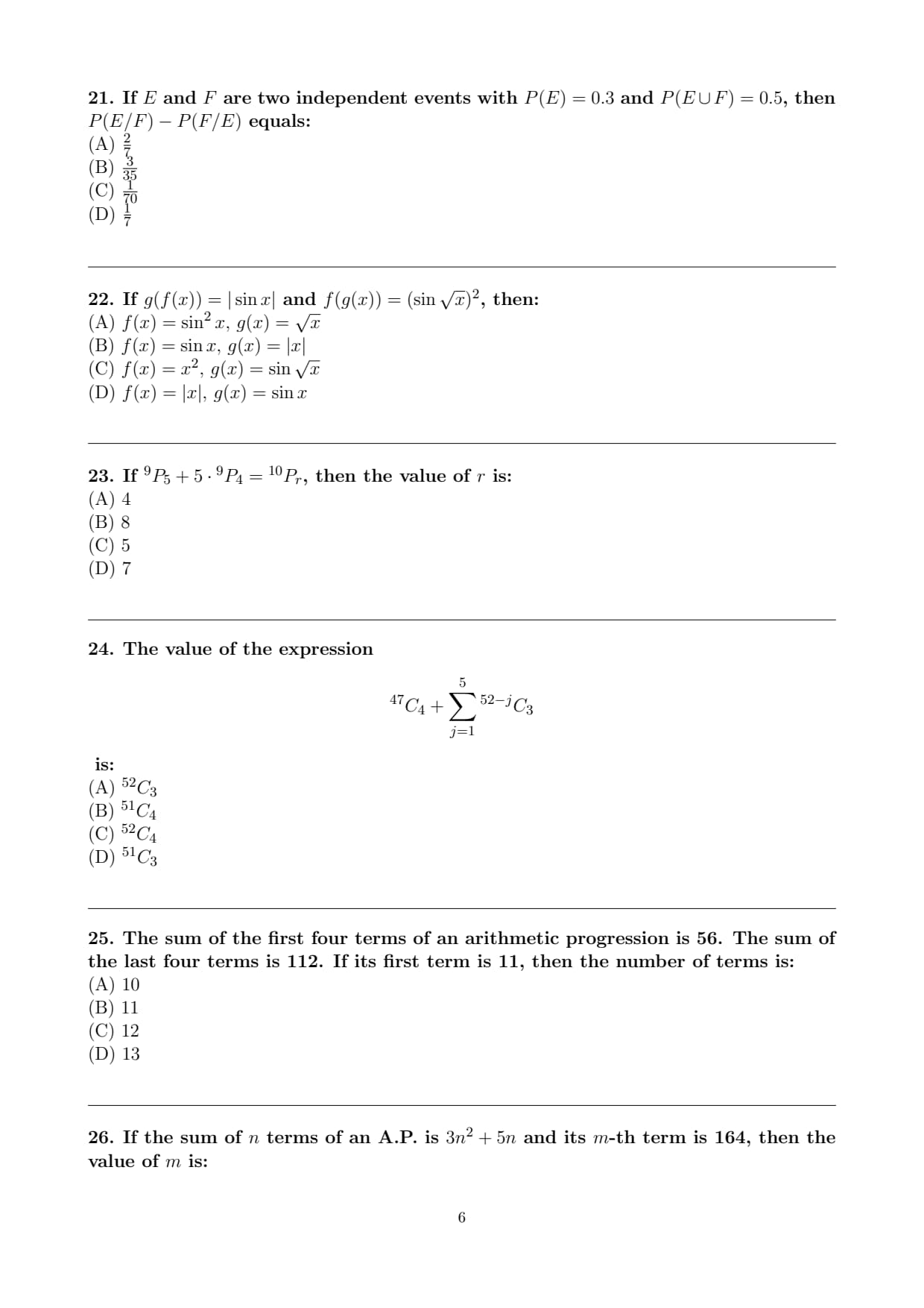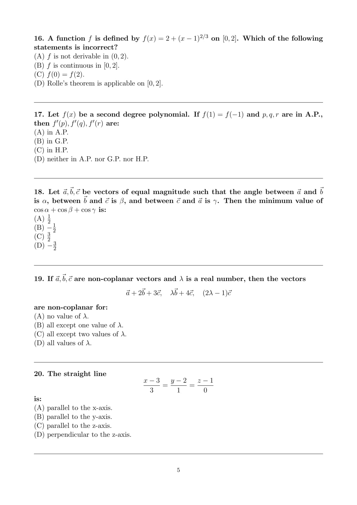 So total: \[ 2 + 2 + 2 = 6 \] Quick Tip: For inverse trigonometric sums: Always recall principal value ranges. If sum equals maximum possible value, each term must be maximal. \( \cos^{-1}x = \pi \Rightarrow x = -1 \)