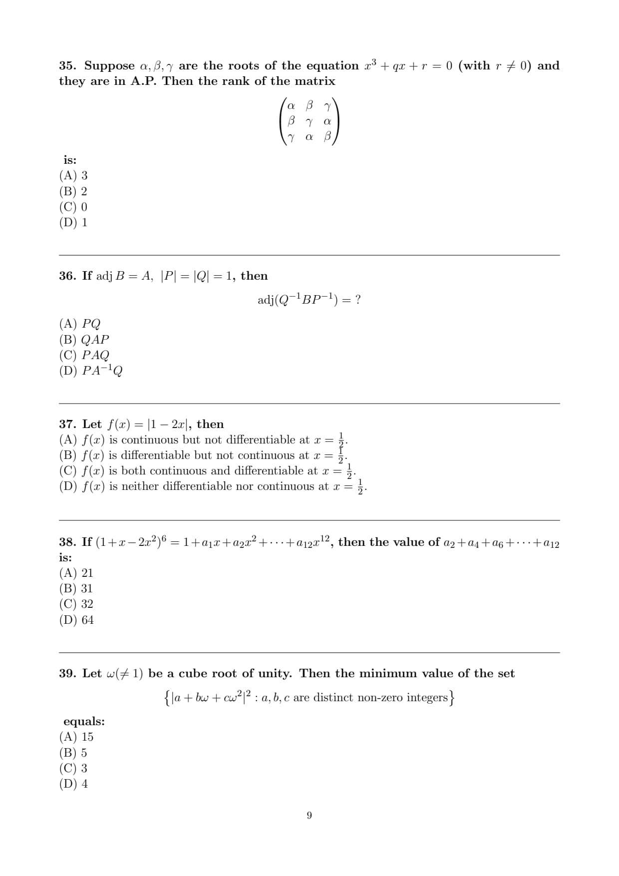 Step 3: {\color{redTotal number of skew symmetric matrices. \[ Total = 3^{\frac{n(n-1)}{2}} \] Quick Tip: For skew symmetric matrices: Diagonal elements are always zero. Only upper triangular entries are independent. Number of independent entries = \( \frac{n(n-1)}{2} \).