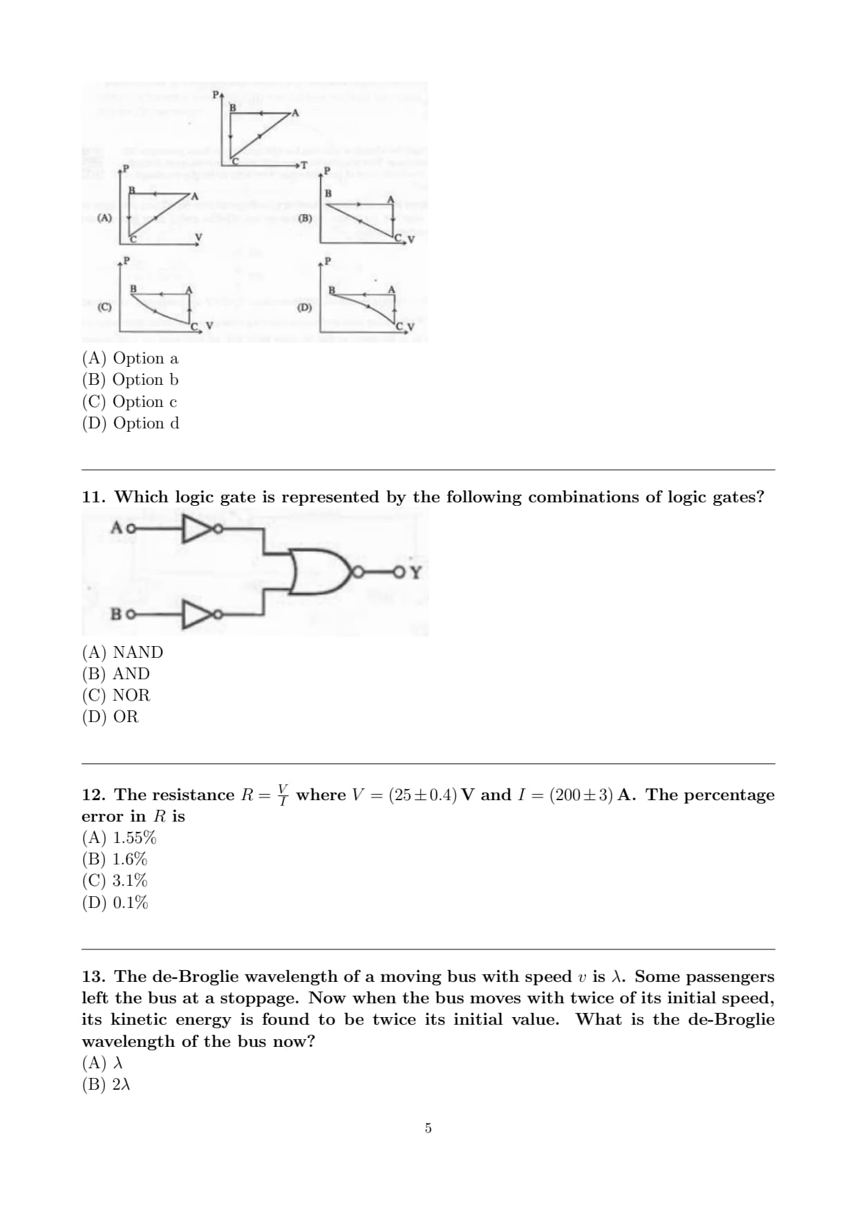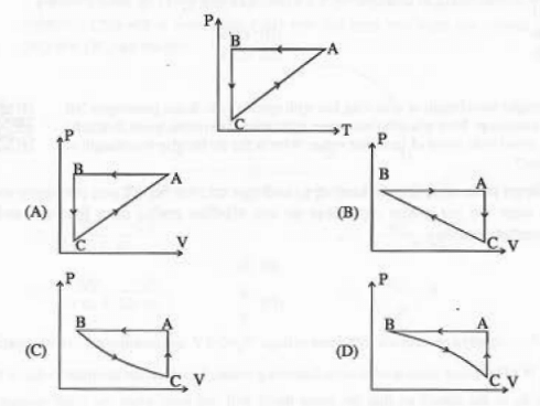 For an ideal gas, a cyclic process ABCA as shown in the P–T diagram. When represented in P–V plot, it would be