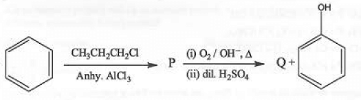 Conclusion: \[ P = Isopropylbenzene, \quad Q = Acetone \] Quick Tip: Cumene process: Benzene + propyl halide \(\rightarrow\) cumene (rearranged) Oxidation + acid cleavage \(\rightarrow\) phenol + acetone Classic industrial reaction