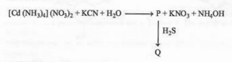 Conclusion: \[ P = K_2[Cd(CN)_4], \quad Q = CdS \] Quick Tip: Coordination chemistry tips: CN\(^-\) forms strong complexes Sulfides of Cd are highly insoluble H\(_2\)S used for qualitative analysis of metal ions