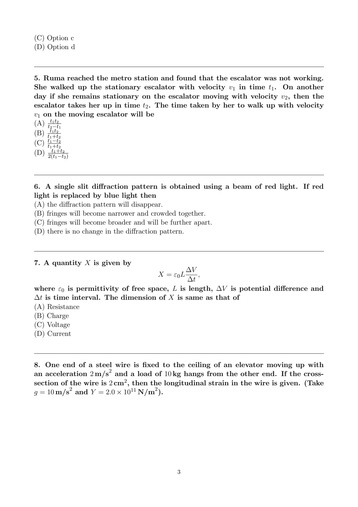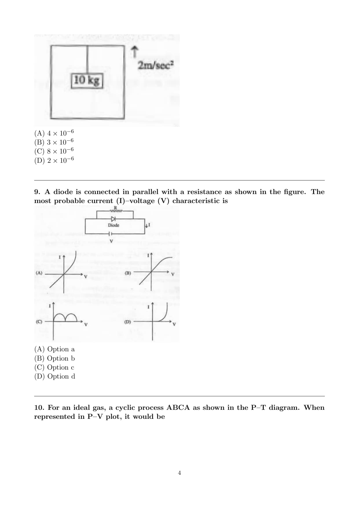 Closest intended option ⇒ \( 4\times10^{-6} \). Quick Tip: Accelerating elevator: Upward acceleration ⇒ effective weight \( m(g+a) \).