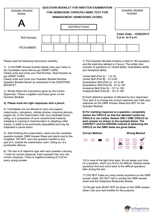 ATMA 2017 Question paper with answer key pdf conducted on February 12, 2017 for Set A is available for download. The exam was successfully organized by Association of Indian Management Institutes (AIMS). The question paper comprised a total of 180 questions.