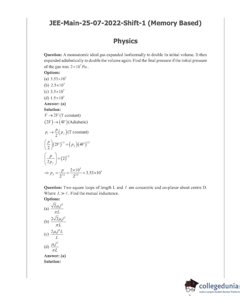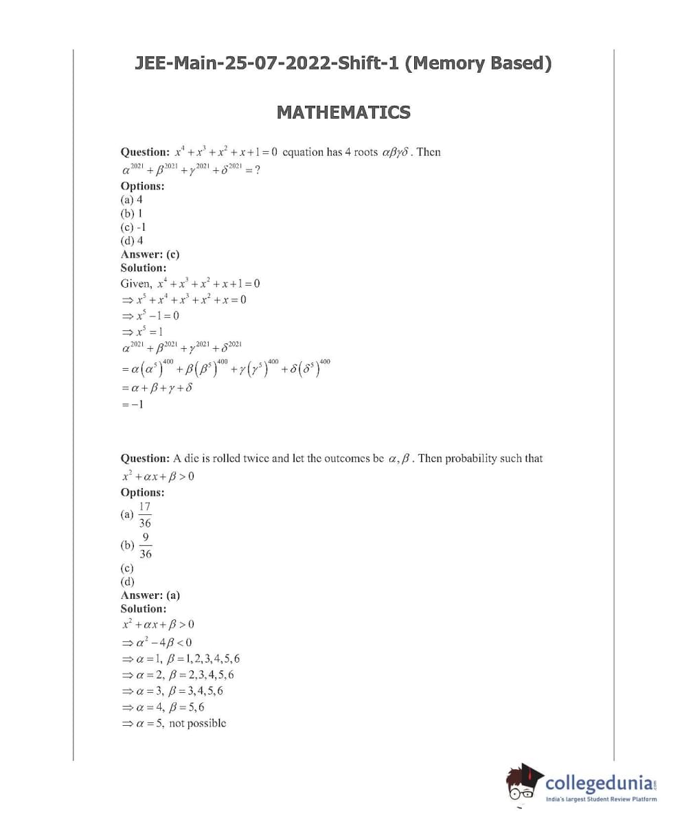 JEE Main 2022 July 25 Shift 1 Question Paper with Solution PDF is available for download. NTA has conducted JEE Main 2022 July 25 Shift 1 paper for B.E./ B.Tech. JEE Main 2022 Question Paper for B.Tech comprises of total 90 questions with 30 questions in each section- Physics, Chemistry and Mathematics (20 MCQs and 10 numerical type). Candidates have to answer any 5 numerical questions in JEE Main 2022 July 25 Shift 1 Question Paper. As per the students’ reaction, the Mathematics section in JEE Main 2022 July 25 Shift 1 Question Paper was the toughest among the three. Candidates rated Physics and Chemistry as easy. The overall difficulty of the question paper was reported as moderate.