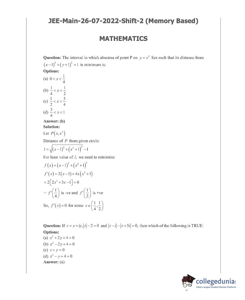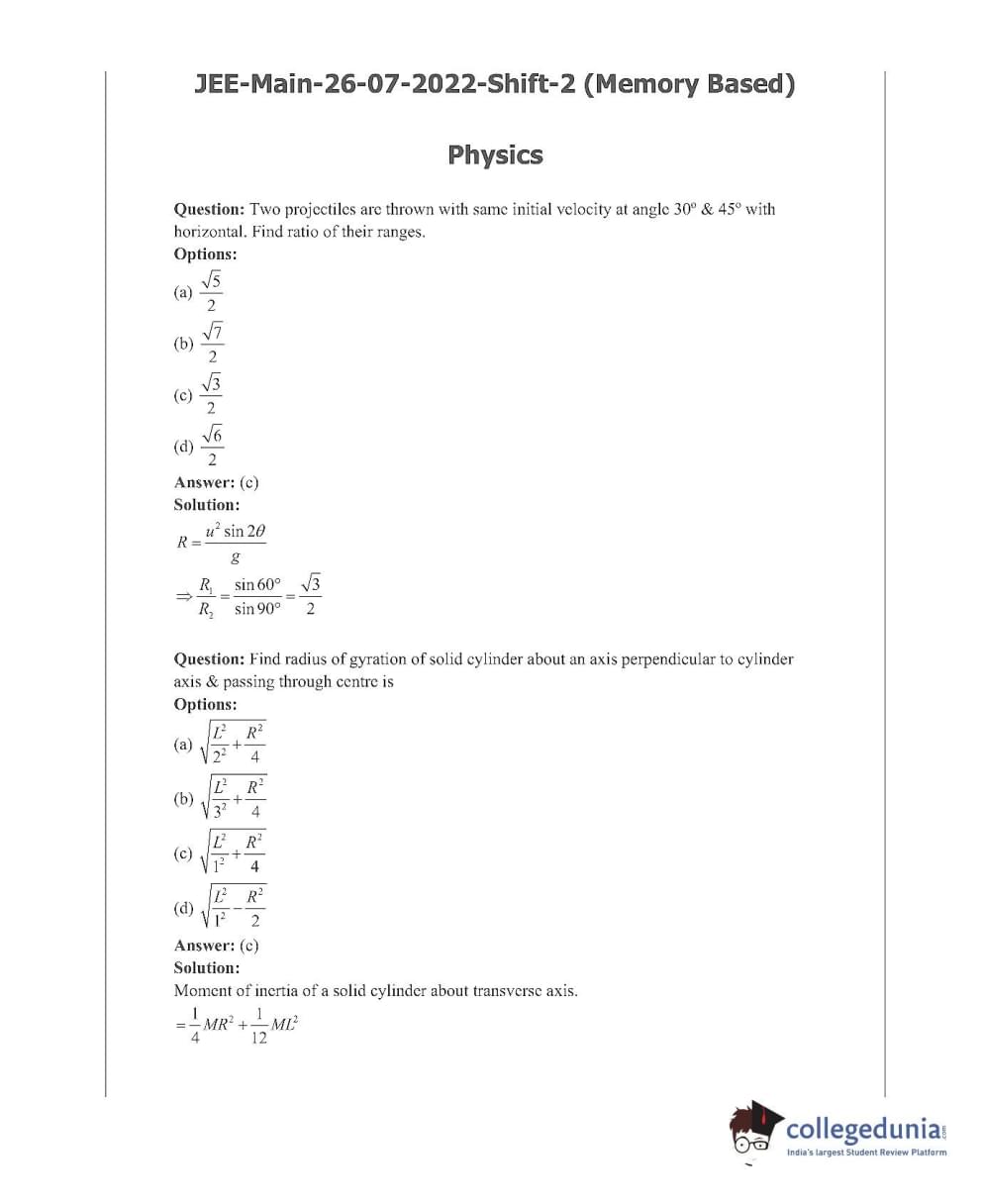JEE Main 2022 July 26 Shift 2 Question Paper with Solution PDF is available for download. NTA conducted JEE Main 2022 July 26 Shift 2 for B.E./ B.Tech paper. JEE Main 2022 Question Paper for B.Tech comprises of total 90 questions with 30 questions in each section- Physics, Chemistry and Mathematics (20 MCQs and 10 numerical type). Candidates have to answer any 5 numerical questions in JEE Main 2022 July 26 Shift 2 Question Paper. As per the initial student reaction, the paper was reported as moderate. Just like the previous sessions, JEE Main 2022 July 26 Shift 2 Mathematics was difficult. Physics was found easy to moderate and Chemistry easy.