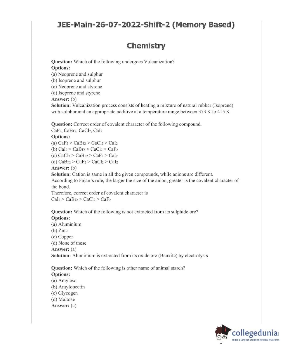 Candidates can also check shift-wise JEE Main 2022 Phase 2 Question Papers with Solution PDFs. These shift-wise question paper PDFs for JEE Main 2022 will help candidates know the overall difficulty, topics with the highest weightage and the type of questions asked in the exam.