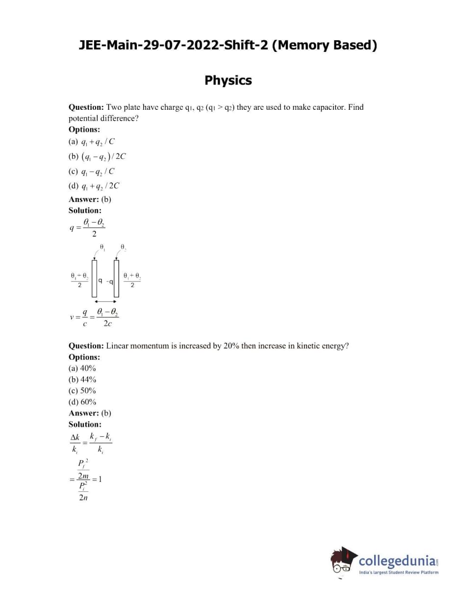 JEE Main 2022 July 29 Shift 2 Question Paper with Solution PDF is available for download. NTA conducted JEE Main 2022 July 29 Shift 2 for B.E./ B.Tech paper. JEE Main 2022 Question Paper for B.Tech comprises of total 90 questions with 30 questions in each section- Physics, Chemistry and Mathematics (20 MCQs and 10 numerical type). Candidates have to answer any 5 numerical questions in JEE Main 2022 July 29 Shift 2 Question Paper. As per the students’ reaction, the question paper is rated moderate with Mathematics as the most difficult section of the three. Check JEE Main 2022 July 29 Shift 2 Paper Analysis