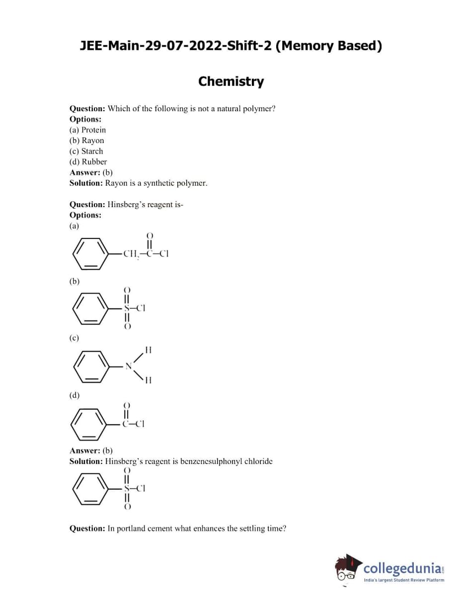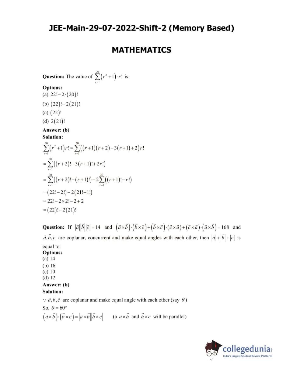 JEE Main 2022 July 29 Shift 2 Question Paper with Solution PDF