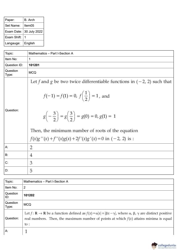 JEE Main 2022 July 30 Shift 1 Question Paper with Solution PDF is available for download. NTA conducted JEE Main 2022 July 30 Shift 1 for B.Arch. JEE Main 2022 Question Paper for Paper 2 (B.Arch) comprises of total 82 questions. JEE B.Arch paper is divided into three sections- 30 questions in Mathematics (20 MCQs and 10 numerical type), 50 questions in Aptitude and 2 questions in Drawing section. Candidates have to answer any 5 numerical questions in JEE Main 2022 July 30 Shift 1 Mathematics paper.