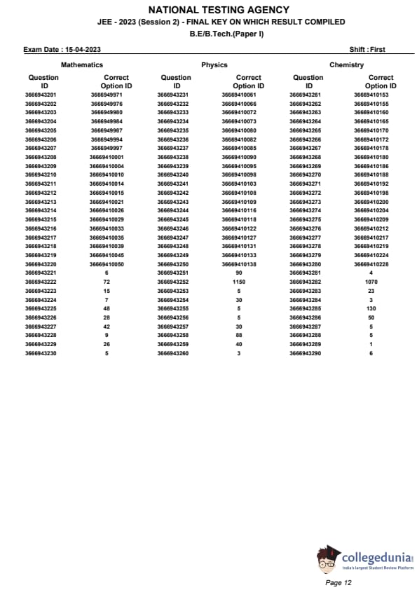 JEE Main 15 April 2023 Shift 1 Question Paper with Answer Key: Coaching Institute PDF