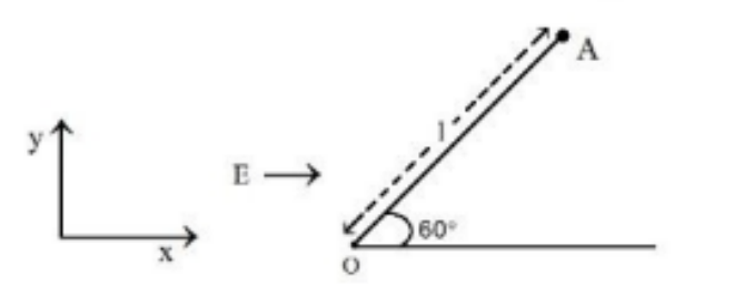 A particle of mass \( m \) and charge \( q \) is fastened to one end \( A \) of a massless string having equilibrium length \( l \), whose other end is fixed at point \( O \). The whole system is placed on a frictionless horizontal plane and is initially at rest. If a uniform electric field is switched on along the direction as shown in the figure, then the speed of the particle when it crosses the x-axis is: