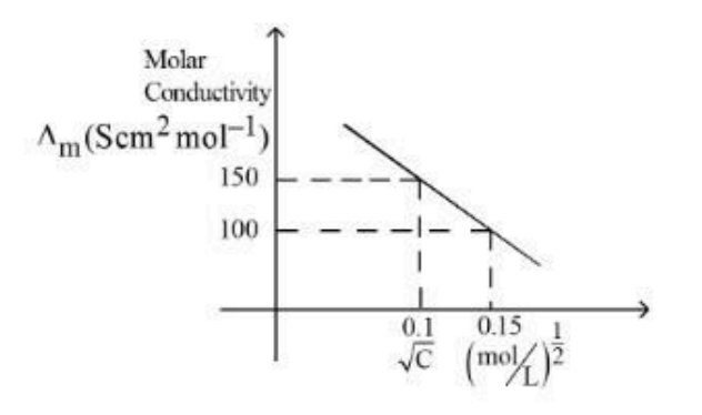Given below is the plot of the molar conductivity vs \( \sqrt{c} \) concentration for KCl in aqueous solution. If, for the higher concentration of KCl solution, the resistance of the conductivity cell is 100 \( \Omega \), then the resistance of the same cell with the dilute solution is 'x' \( \Omega \). The value of \( x \) is: