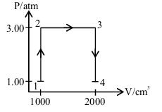 A perfect gas (0.1 mol) having \( \bar{C}_V = 1.50 \) R (independent of temperature) undergoes the above transformation from point 1 to point 4. If each step is reversible, the total work done (w) while going from point 1 to point 4 is (\hspace{3cm) J (nearest integer)