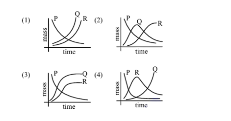 A radioactive material P first decays into Q and then Q decays to non-radioactive material R. Which of the following figure represents time dependent mass of P, Q and R?