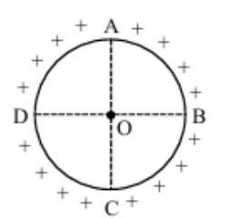 A metallic ring is uniformly charged as shown in the figure. AC and BD are two mutually perpendicular diameters. Electric field due to arc AB to O is ‘E’ magnitude. What would be the magnitude of electric field at ‘O’ due to arc ABC?