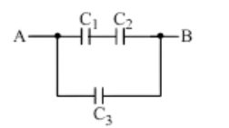 Three parallel plate capacitors \( C_1 \), \( C_2 \), and \( C_3 \) each of capacitance 5 µF are connected as shown in the figure. The effective capacitance between points A and B, when the space between the parallel plates of \( C_1 \) capacitor is filled with a dielectric medium having dielectric constant of 4, is: